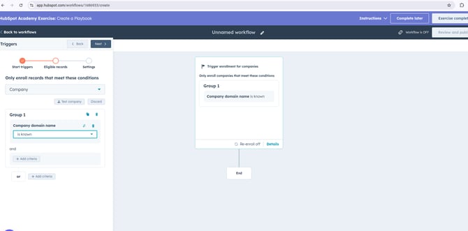 Set your desired enrollment triggers (e.g., when a new Company record is created, or when the