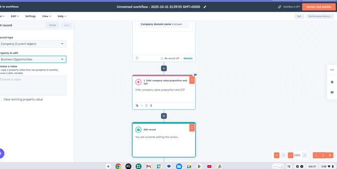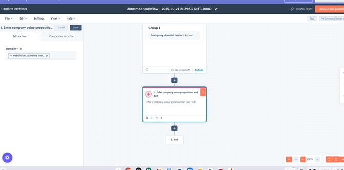 The "Infer company value proposition and ICP" action runs and generates several insights, which are outputs you must then save or use in subsequent workflow steps. The output is typically available as action outputs, which can be used to update standard or custom properties.